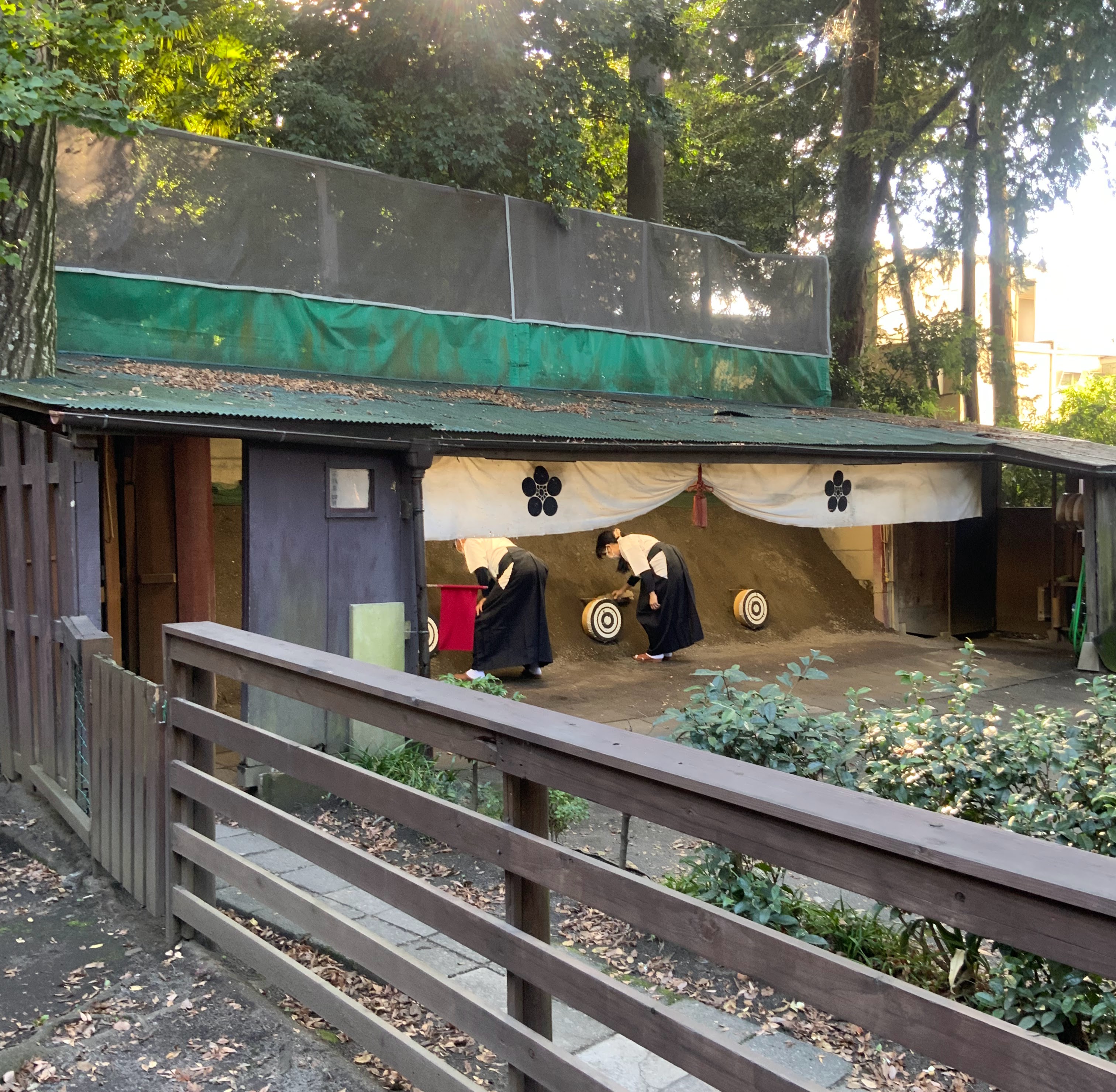 小金井神社弓道場は、小金井神社本殿の西側の境内地を借用し、会員の作業奉仕により樹木伐採、整地を行い、垜、射場、控室などを建設し、昭和37年に完成した弓道場です。 スギ、イヌシデ、ケヤキ等の高木に囲まれており、朝の6時より夜の9時まで365日、緑陰の中で弓を引ける環境にあります。神社様・氏子様の活動へのご理解のもと、会員の奉仕により維持・管理されてきました。